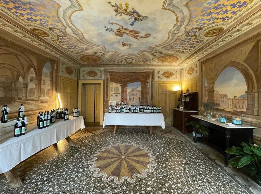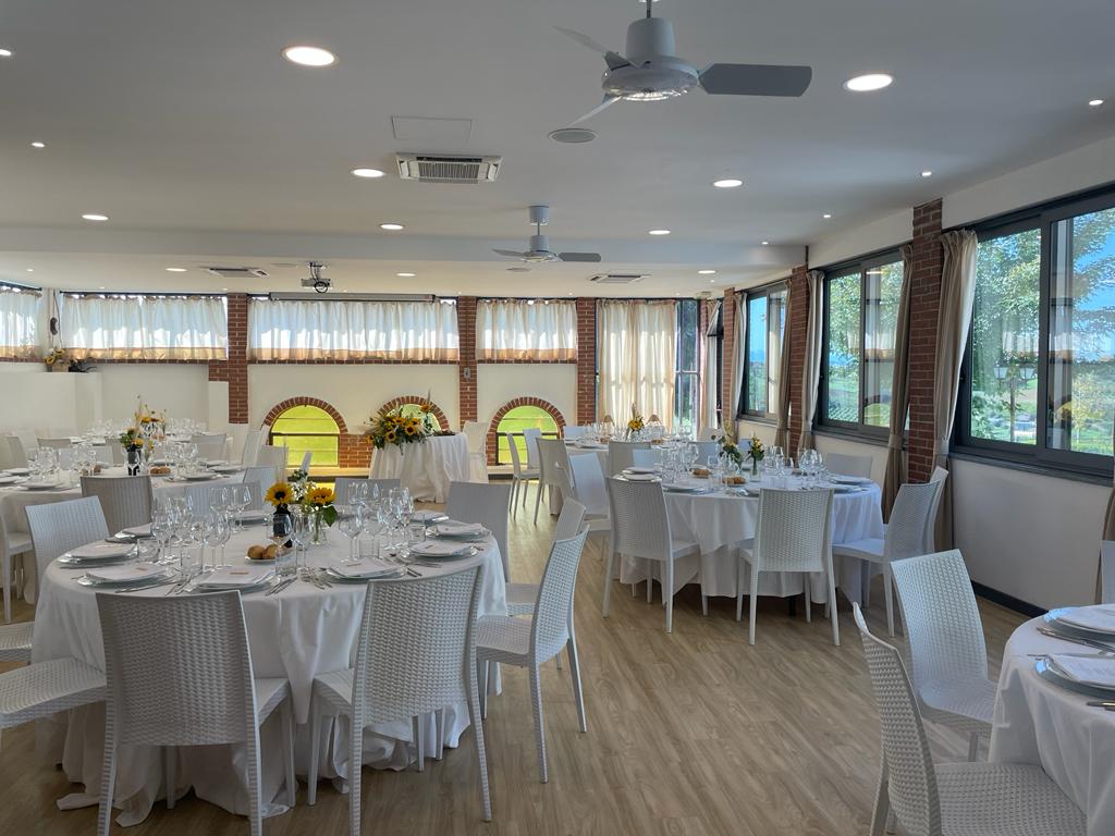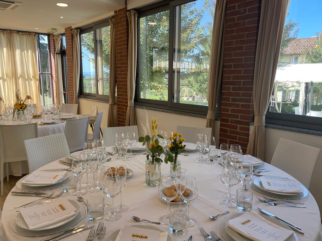The classic setting includes a rich aperitif organized outdoors and in the historic cellar, followed by the meal served in the events room set up with round tables and white chairs that can be upholstered.